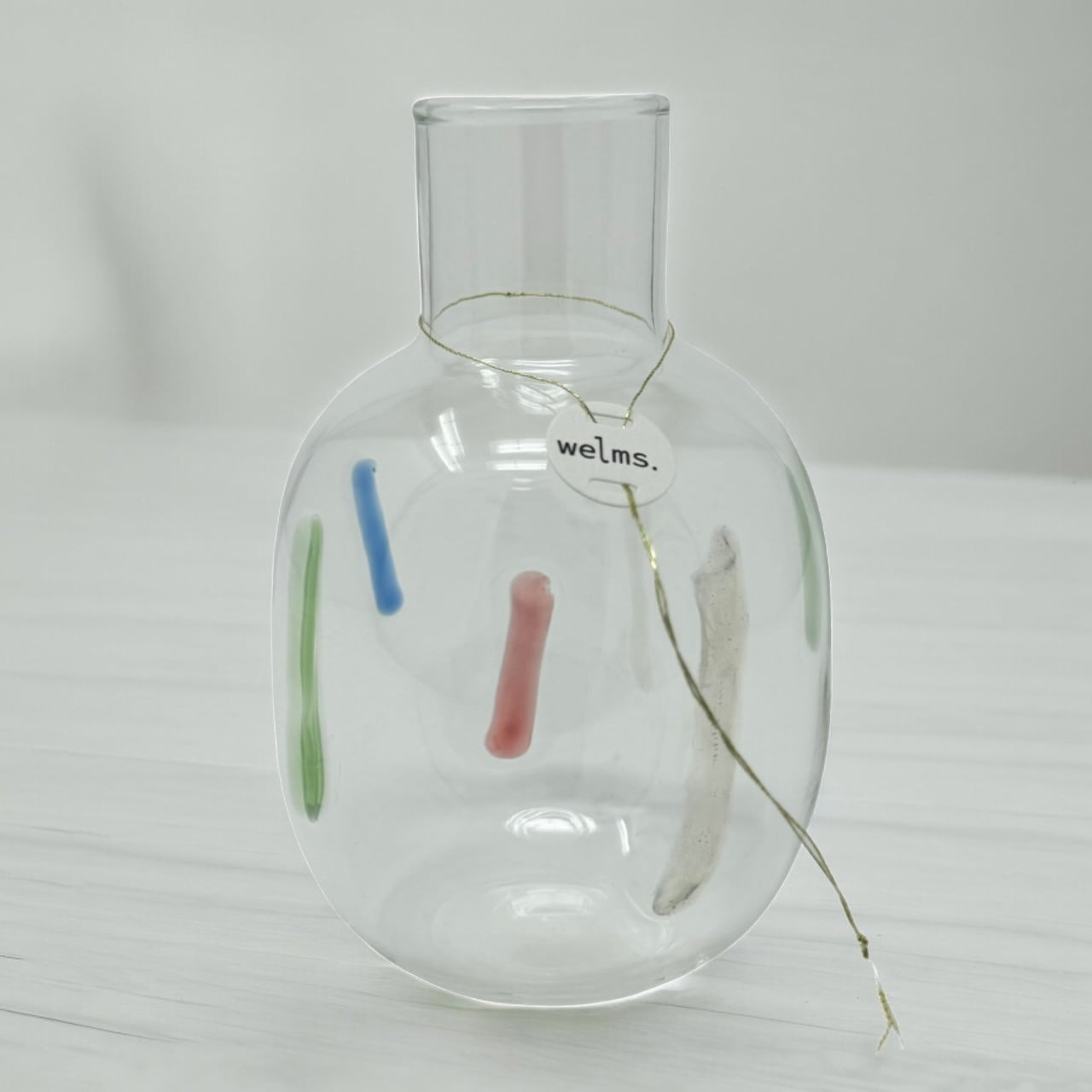 透明度の高い吹きガラスにフリットやケインを使って色や柄を付けていくガラスベース。